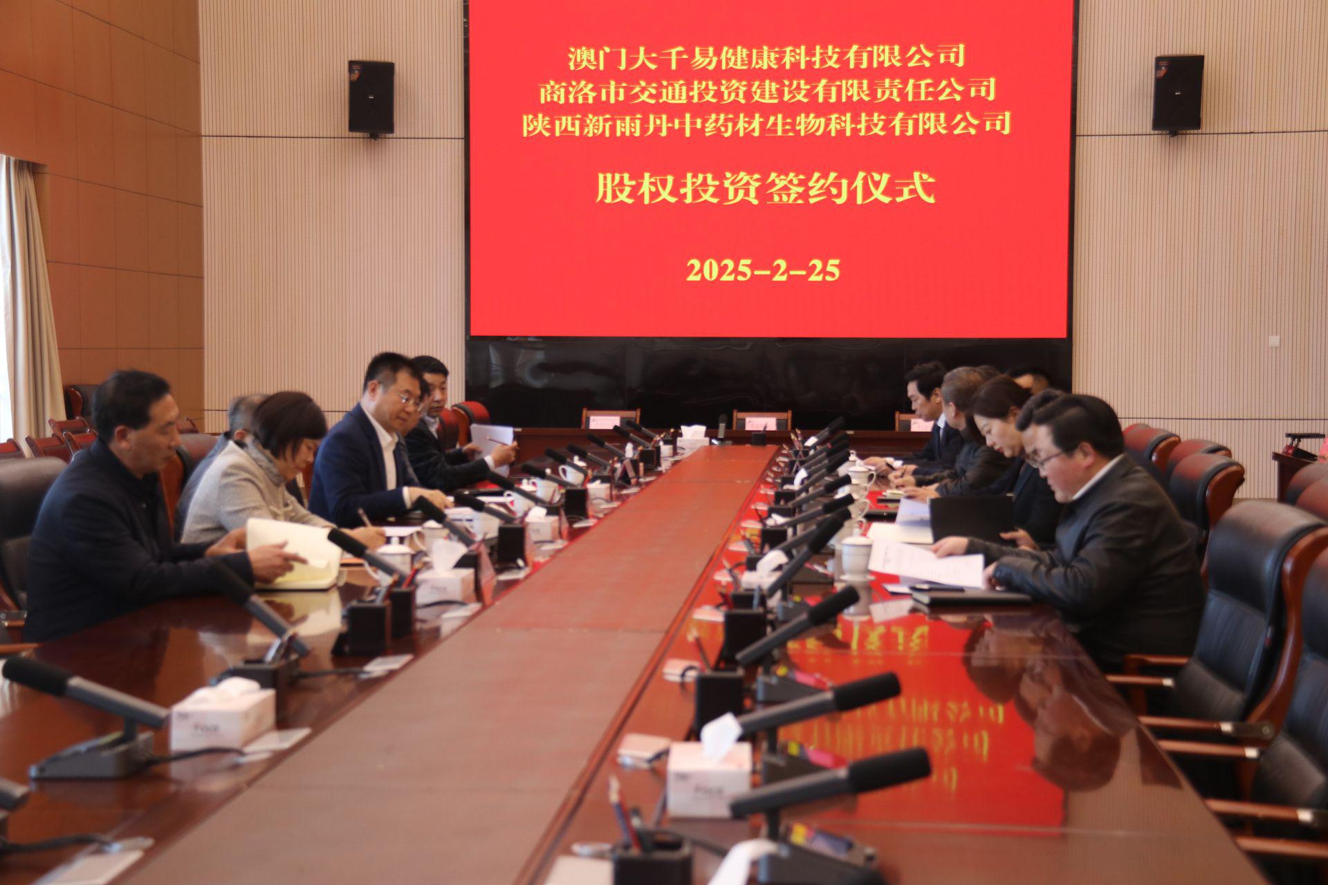 2月25日,澳門大千易健康科技有限公司、市交投公司、陜西新雨丹中藥材生物科技有限公司在商洛市行政中心舉行股權(quán)投資簽約儀式。市委常委、市委統(tǒng)戰(zhàn)部部長劉偉,副市長溫琳,澳門電子金融產(chǎn)業(yè)貿(mào)易促進會執(zhí)行會長劉鋼,市工信局局長、市國資委主任楊春華,市衛(wèi)健委主任馬建琦、市招商服務(wù)中心主任陳林共同見簽。